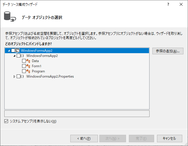 Windows Formsのアプリケーションを作っていて,データバインディングを使ってみたが,Visual Studio データソース構成ウィザードはAny CPU構成しか対応していないかもしれない。